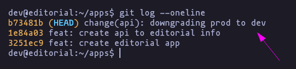 - Vamos a listar los log para ver los mensajes de los commits que ha ido haciendo, y vemos como que antes la api estaba corriendo como el usuario